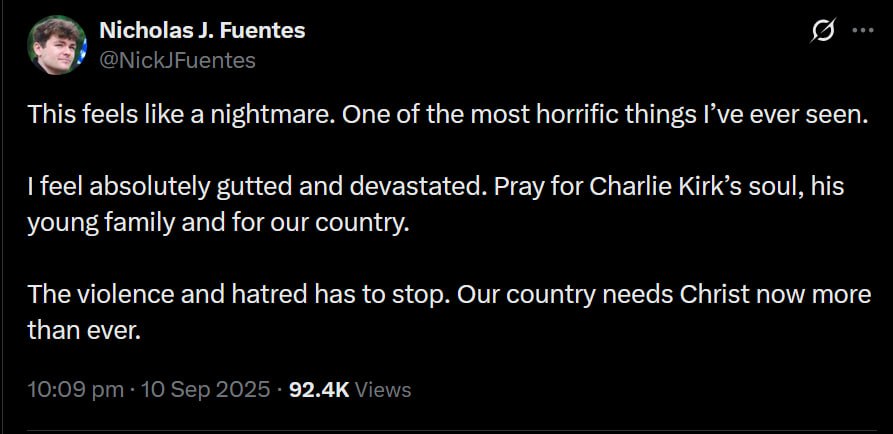 In a heartfelt social media post, Fuentes urged his followers to pray for Kirk"s soul, his young family, and the nation, emphasizing the urgent need for unity in the face of increasing violence and hatred. "Our country needs Christ now more than ever," he added, highlighting a call for spiritual reflection amidst the tragedy.