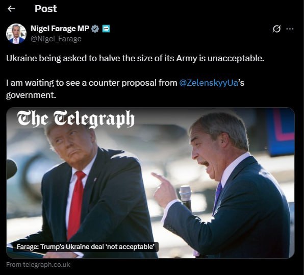 #BREAKING | Nigel Farage, leader of the UK Reform Party and Member of Parliament, has rejected U.S. President Donald Trump"s proposal for peace in Ukraine. Farage described the proposal, which includes a request for Ukraine to reduce the size of its army by half, as "unacceptable." He is currently awaiting a counter proposal from Ukrainian President Volodymyr Zelensky.