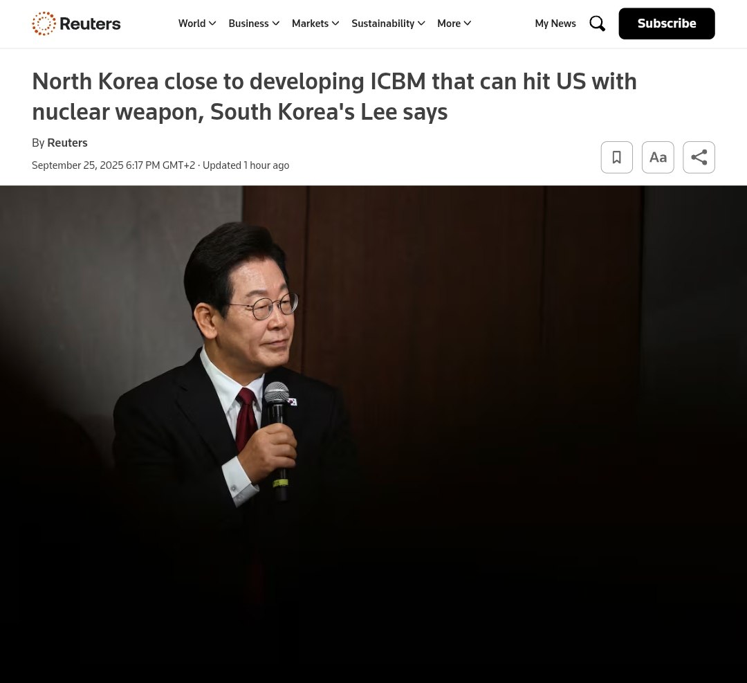 North Korea is reportedly in the final stages of developing an intercontinental ballistic missile (ICBM) capable of delivering a nuclear weapon to the United States, according to South Korea"s president. This statement was made on Thursday, September 25, 2025. However, the president noted that North Korea has not yet mastered the technology required for re-entry of the missile into the Earth"s atmosphere.
