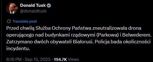Polish President Donald Tusk reported that a drone was shot down over a government building in Poland. In connection with this incident, two Belarus citizens have been arrested.