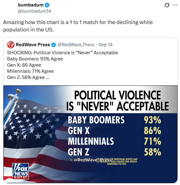 According to a recent survey, a significant majority of Americans believe that political violence is "never" acceptable. The survey results indicate that 93% of Baby Boomers, 86% of Generation X, 71% of Millennials, and 58% of Generation Z share this view.
