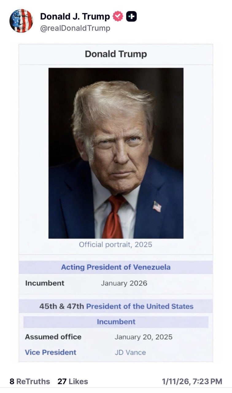 Former President Donald Trump posted an edited version of his Wikipedia profile on social media, labeling himself as the "Acting President of Venezuela." This post was made public on Sunday, January 11, 2026.