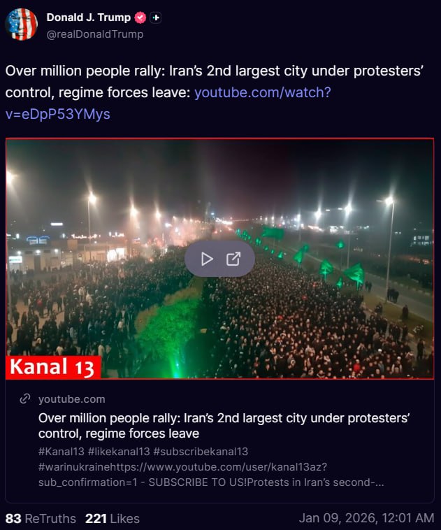 On January 9, 2026, President Trump shared a YouTube video showcasing protests in Iran. The video, posted on his channel, claims that over a million people participated in the demonstrations. However, the assertion regarding the number of attendees has been labeled as false by various sources.