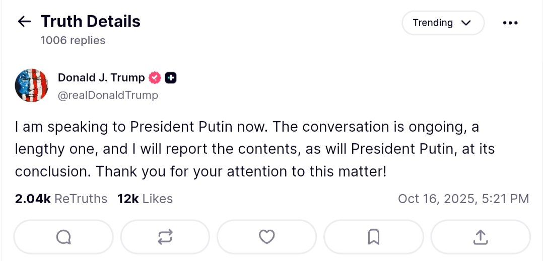 US President Donald Trump is currently engaged in a conversation with President Vladimir Putin. The discussion is described as lengthy and ongoing. Both leaders are expected to report on the contents of the conversation upon its conclusion.