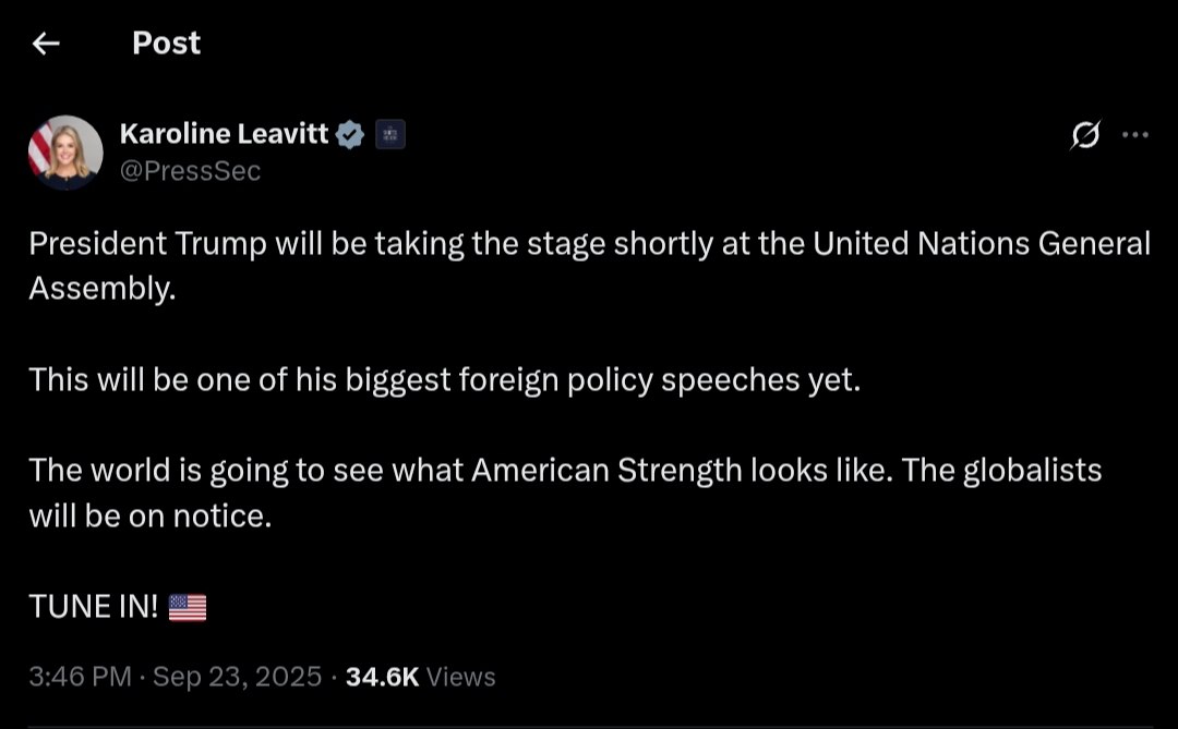 #BREAKING | White House Press Secretary Karoline Leavitt announced that President Trump will be delivering a significant speech at the United Nations General Assembly shortly. This address is expected to be one of his most important foreign policy speeches to date.
