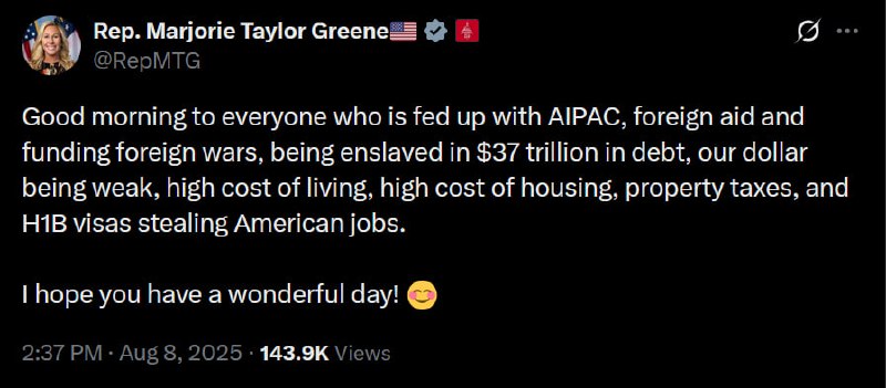 In a recent post on social media platform X, Republican Representative Marjorie Taylor Greene voiced her frustration with various issues plaguing American citizens, including foreign aid, AIPAC"s influence, and economic challenges. Her message resonated with many constituents who feel burdened by a $37 trillion national debt, rising living costs, and job competition from H1B visa workers.