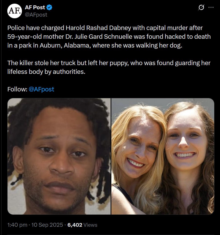 Harold Rashad Dabney, 34, has been charged with capital murder following the brutal killing of 59-year-old Dr. Julie Gard Schnuelle, a retired professor from Auburn University. Dr. Schnuelle was found hacked to death in a park in Auburn, Alabama, on Tuesday while walking her dog.