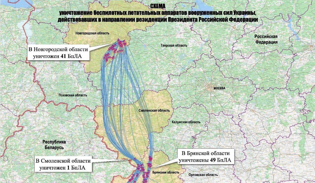 Russia"s Ministry of Defense has released a map indicating the flight paths of 91 Ukrainian long-range drones that were allegedly launched on December 28-29, targeting President Vladimir Putin"s residence in the Novgorod region. Moscow claims that all drones were intercepted and that there was no damage caused by the alleged attack.