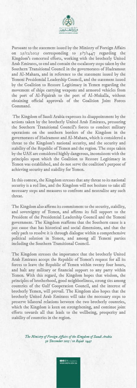 The Saudi Foreign Ministry"s statement referenced a prior announcement made on December 25, 2025 (corresponding to 5/7/1447 in the Islamic calendar), which outlined Saudi Arabia"s commitment to working alongside the UAE to mitigate the escalating actions taken by the STC in the Yemeni governorates of Hadramout and Al-Mahara. The STC has been involved in efforts to assert control over these areas, which has raised concerns about stability and governance in Yemen.