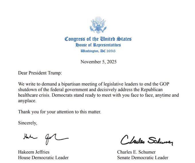 Senate Majority Leader Chuck Schumer and House Minority Leader Hakeem Jeffries have sent an open letter to U.S. President Donald Trump, urging him to convene a bipartisan meeting with legislative leaders. The purpose of this meeting is to address the ongoing federal government shutdown initiated by the Republican Party and to tackle what they describe as a Republican healthcare crisis.