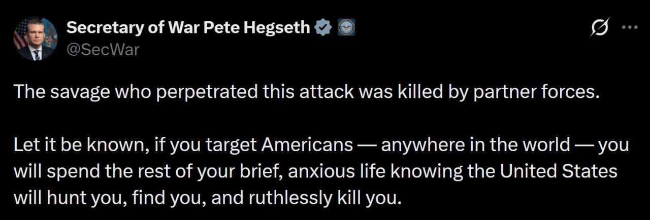 Secretary of War Pete Hegseth confirmed that the individual responsible for a recent attack targeting Americans has been killed by partner forces. Hegseth emphasized that any individual who targets Americans, regardless of location, will face relentless pursuit by the United States, leading to their eventual demise.