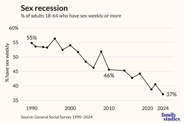 In a striking shift, a recent study reveals that the percentage of U.S. adults aged 18 to 64 reporting weekly sexual activity has plunged from 55% in 1990 to just 37% in 2024. This trend is particularly pronounced among young adults, who are experiencing the most significant decline.