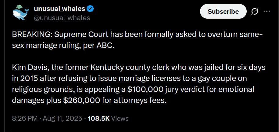 Supreme Court Faces Challenge to Overturn Same-Sex Marriage Ruling as Kim Davis Appeals $360K Verdict
