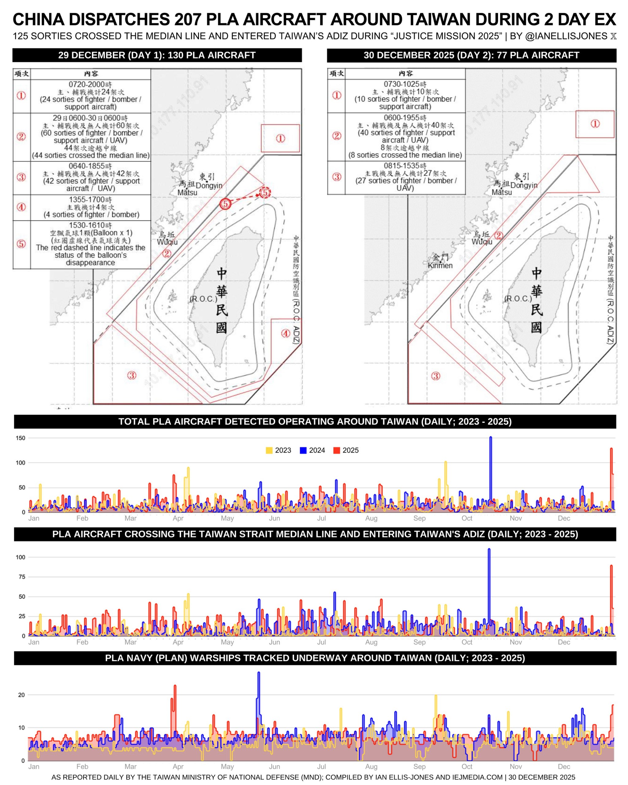 Taiwan has detected a record 207 Chinese People"s Liberation Army (PLA) aircraft during the first two days of the military exercise titled "Justice Mission 2025." This figure surpasses the previous two-day total of 178 aircraft incursions.