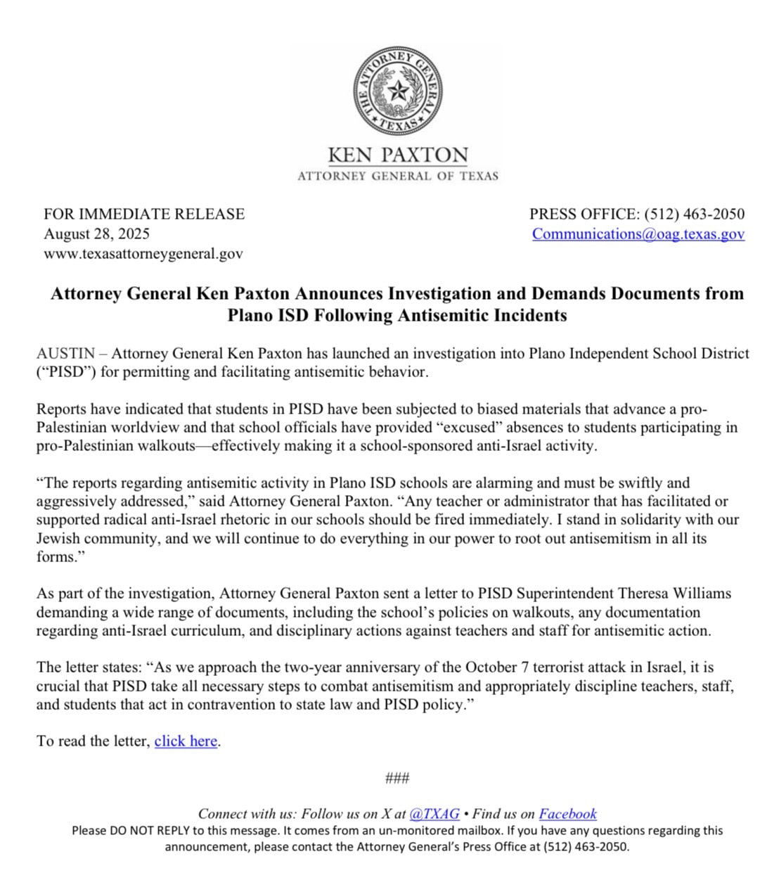 Texas Attorney General Ken Paxton announced an investigation into the Plano Independent School District (ISD) on Friday, August 29, 2025, in response to several reported antisemitic incidents. Paxton is demanding documentation from the district and has called for the immediate dismissal of any teacher or administrator who has supported or facilitated radical anti-Israel rhetoric in schools.