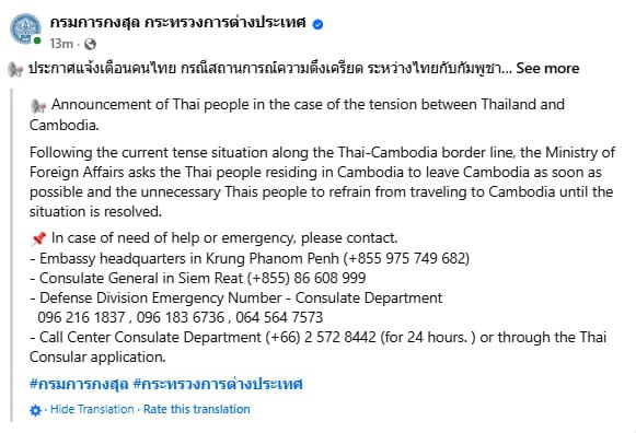 Thai Foreign Ministry Urges Citizens to Evacuate Cambodia Amid Border Tensions