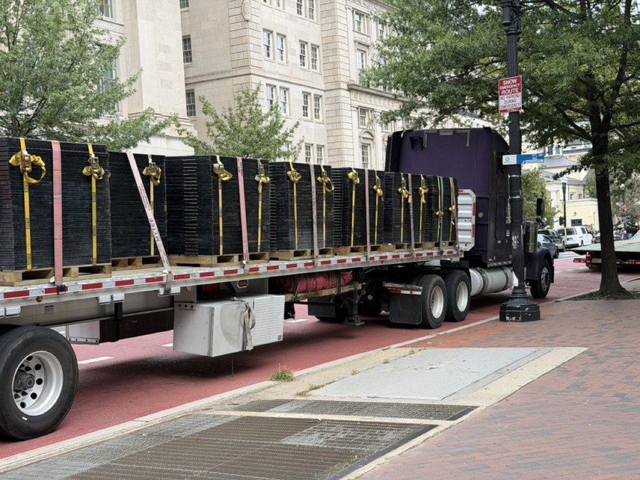 BREAKING: Truckloads of anti-scale fencing have been delivered to the White House in Washington, D.C. The delivery is part of ongoing security measures at the presidential residence.