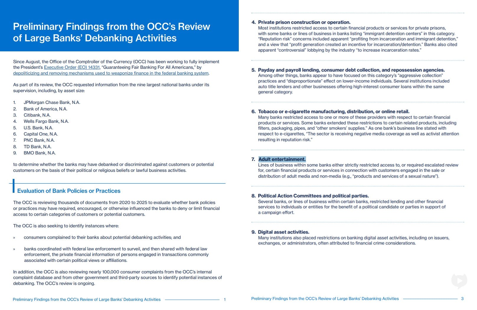 The Trump administration has released a new report aimed at ensuring equitable banking practices for all Americans, which highlights discrimination against pornographic companies. The report, titled "Guarantee Fair Banking For All Americans," indicates that these companies have faced inappropriate discrimination in banking services.