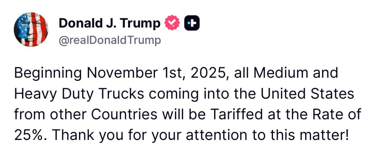 U.S. President Donald J. Trump announced that beginning November 1, 2025, all medium-duty and heavy-duty semi-trucks entering the United States will be subject to a tariff rate of 25%. This decision is part of the administration"s ongoing trade policy.