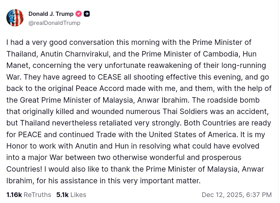 US President Donald Trump announced that Thailand and Cambodia have agreed to a ceasefire effective this evening. This decision follows a call between Trump and the leaders of both Asian nations.