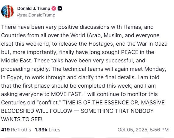 According to Trump, the discussions have been successful and are progressing rapidly. He mentioned that technical teams are scheduled to meet again on Monday in Egypt to finalize details of the negotiations. Trump indicated that the first phase of the discussions should be completed within the week and urged all parties involved to act quickly, emphasizing that "time is of the essence" to prevent further bloodshed.