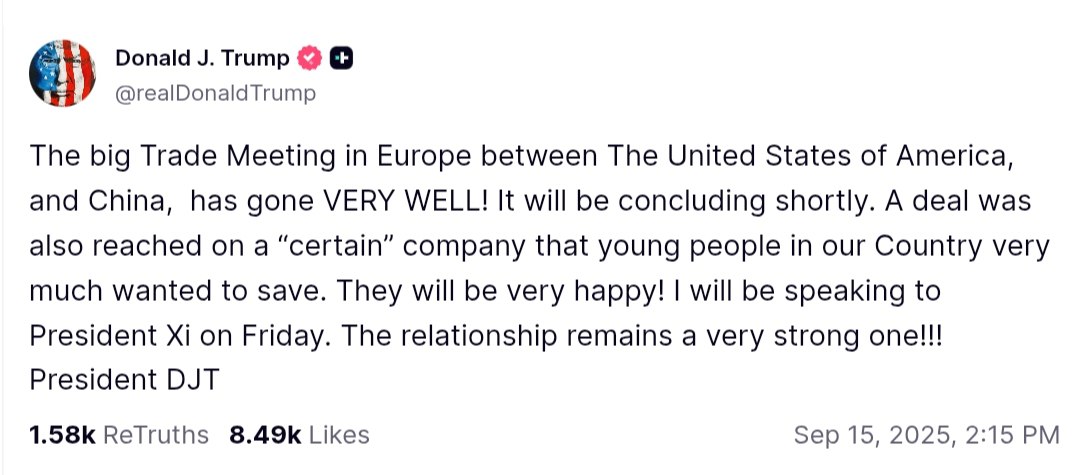 US President Donald Trump announced that a significant trade meeting between the United States and China has concluded successfully. The meeting took place in Europe and was described by Trump as having gone "VERY WELL." He indicated that a deal was reached concerning a "certain" company that is of particular interest to young people in the United States, stating that they would be "very happy" with the outcome.