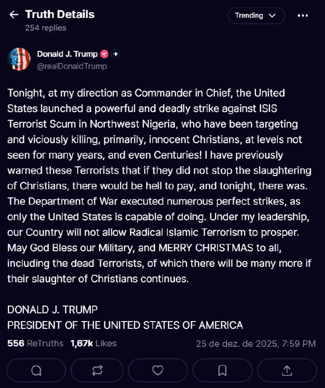 On December 25, 2025, President Donald J. Trump announced that the United States Air Force has conducted significant air strikes against Islamic State (ISIS) terrorists in Northern Nigeria. This military action was taken under his direct orders and is aimed at combating the ongoing violence against Nigerian Christians perpetrated by these terrorist groups.