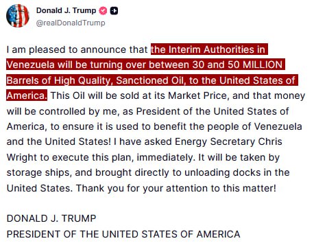 Former President Donald Trump announced that Venezuela will be turning over "30 and 50 million barrels of high quality, sanctioned oil" to the United States. The oil is to be sold at market price, with the financial proceeds reportedly controlled by Trump.