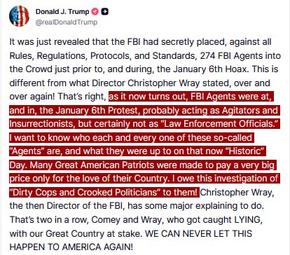 Former President Donald Trump claimed that 274 FBI agents were "secretly placed" in the crowd during the January 6th Capitol riot and suggested that they were "probably acting as Agitators and Insurrectionists." He called for an investigation into what he referred to as "Dirty Cops and Crooked Politicians," stating that this inquiry is owed to the "Patriots that were made to pay a big price."