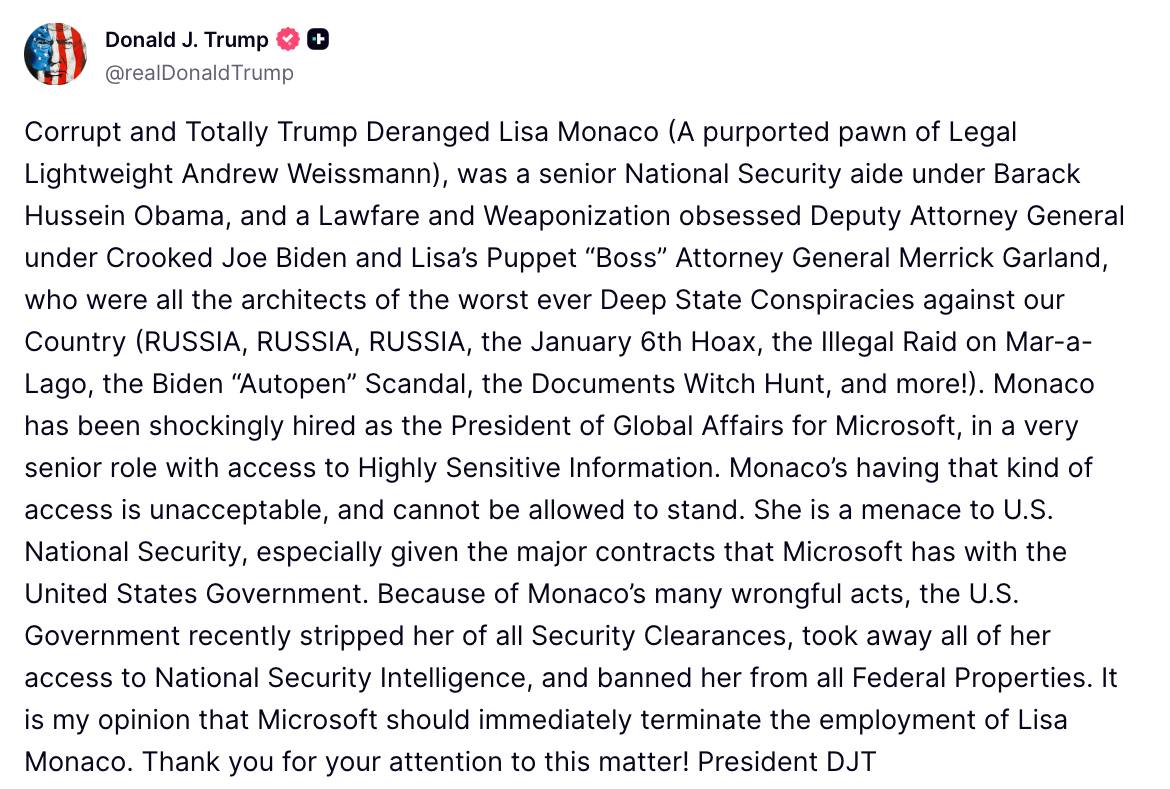 As of now, there has been no official response from Microsoft regarding Trump"s call for Monaco"s dismissal.