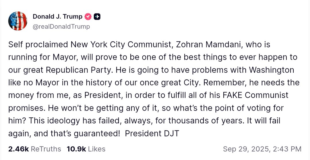 Trump emphasized that Mamdani would require federal funding to fulfill what he described as "FAKE Communist promises" but indicated that he would not receive any financial support from the federal government. The President asserted that Communist ideology has historically failed and predicted that it would fail again.