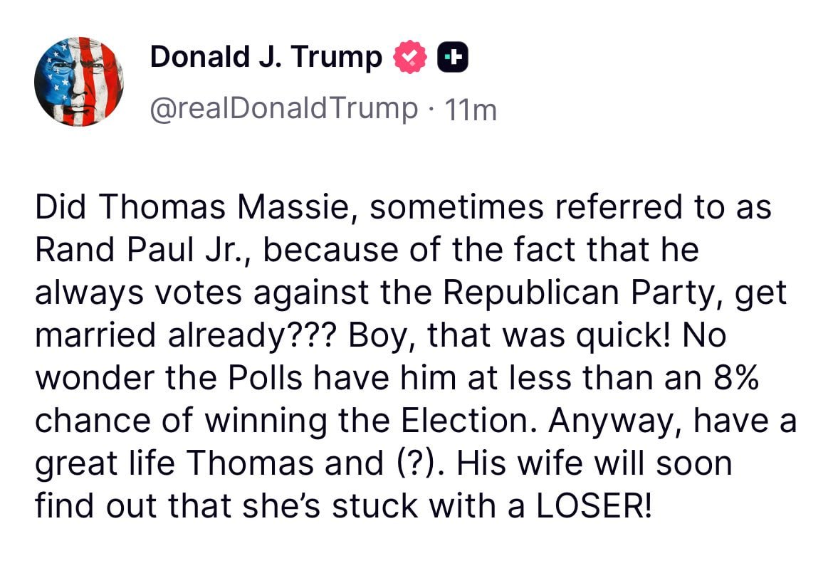 Former President Donald Trump criticized Representative Thomas Massie, a libertarian from Kentucky, for remarrying a year after the death of his wife. Trump questioned the timing of Massie"s decision, suggesting it was "too soon" for him to enter into a new marriage.