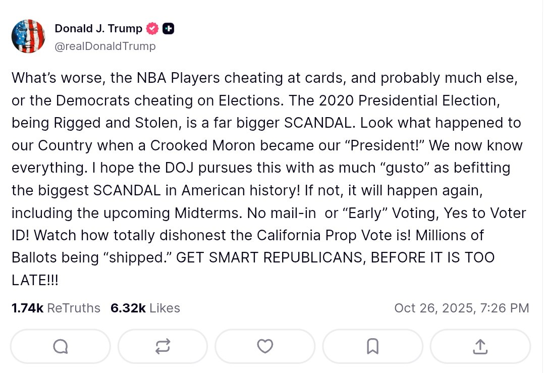 US President Donald J. Trump issued a statement today addressing the recent allegations of card cheating involving NBA players. He compared these allegations to what he describes as the "rigged and stolen" 2020 presidential election, calling it the "biggest SCANDAL in American history."