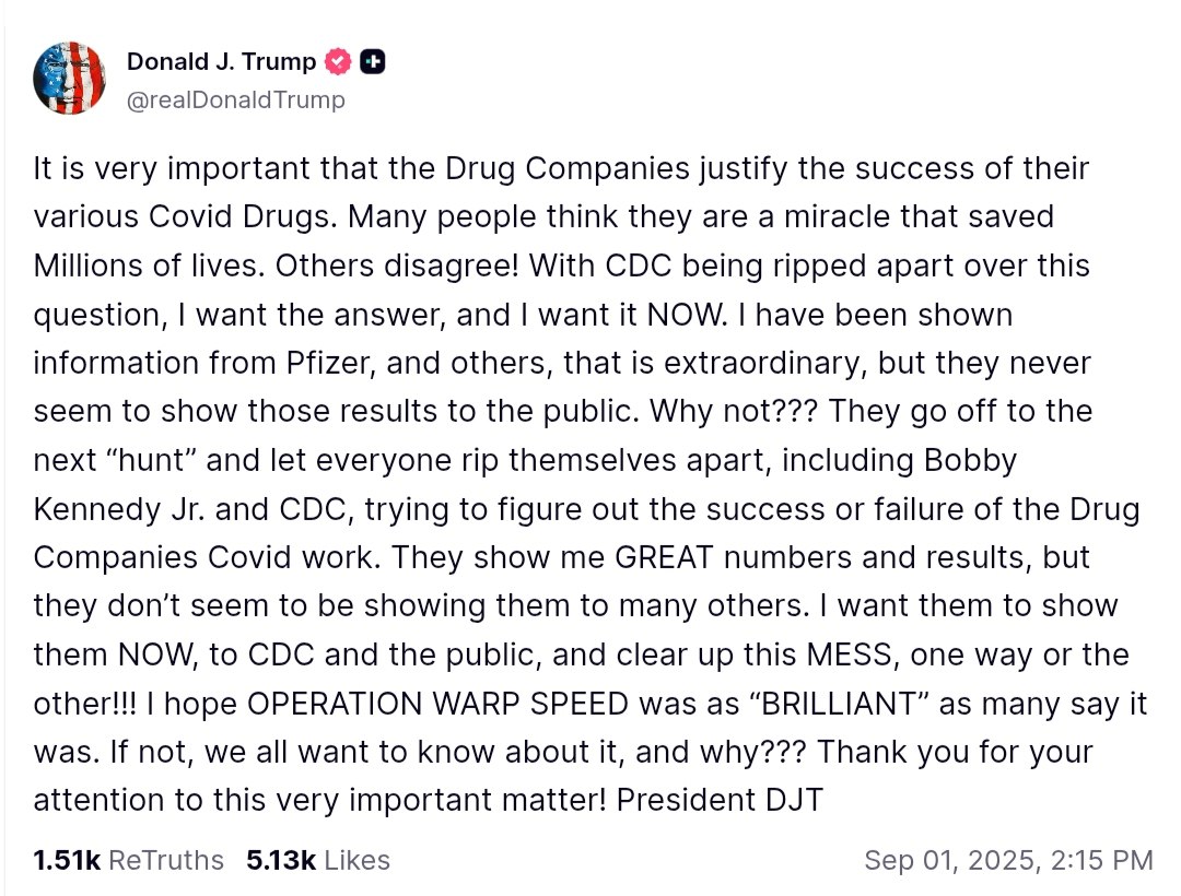US President Donald J. Trump has demanded that pharmaceutical companies, particularly Pfizer, release detailed data regarding the effectiveness of their COVID-19 vaccines. In a statement issued today, Trump called for transparency to address ongoing debates and controversies surrounding vaccine efficacy.