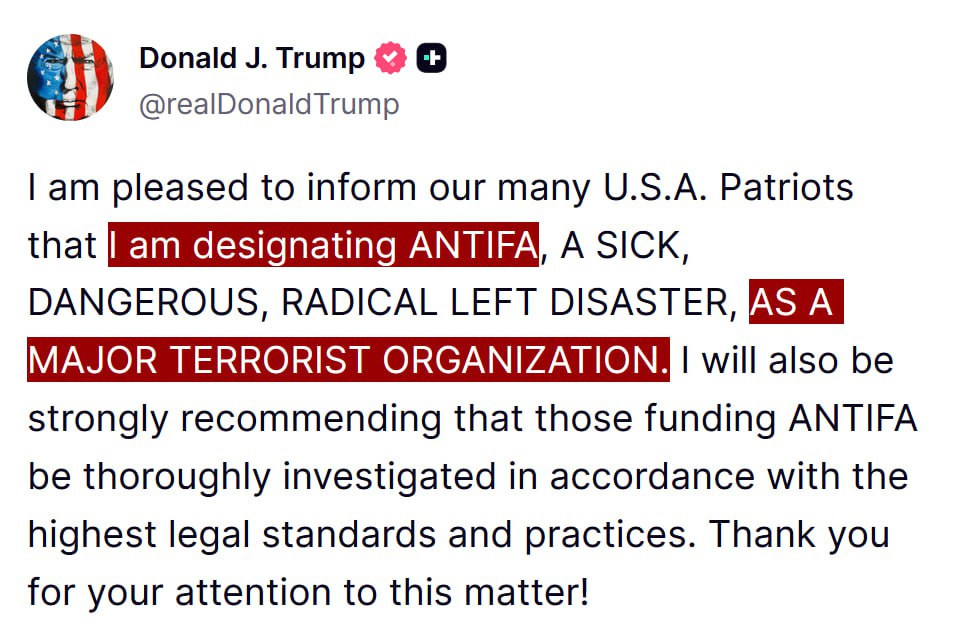 Former President Donald Trump has announced that he is designating ANTIFA as a "major terrorist organization." This declaration was made via his social media platform on Wednesday, September 17, 2025.