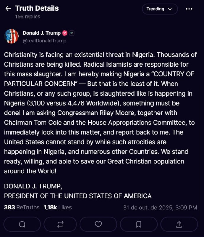 US President Donald Trump has designated Nigeria as a "Country of Particular Concern," citing the killing of thousands of Christians and an "existential threat" to Christianity in the region. This announcement was made on Saturday, November 1, 2025.