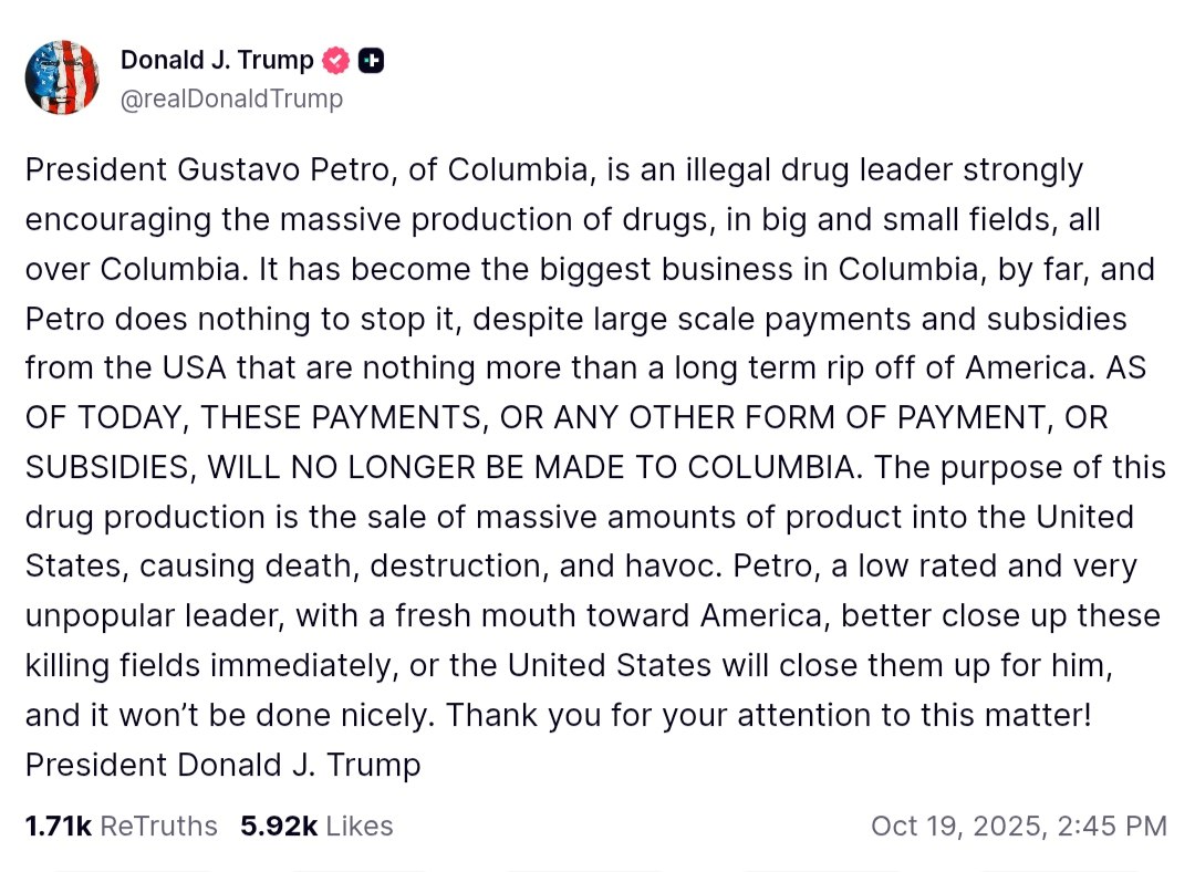 Trump stated that, effective immediately, all payments, subsidies, or any other forms of financial assistance will no longer be provided to Colombia. He emphasized that the drug production is primarily aimed at supplying the U.S. market, resulting in widespread harm and chaos. Trump characterized Petro as an unpopular leader and warned that if he does not take action to dismantle these drug operations, the United States will intervene, threatening military action.