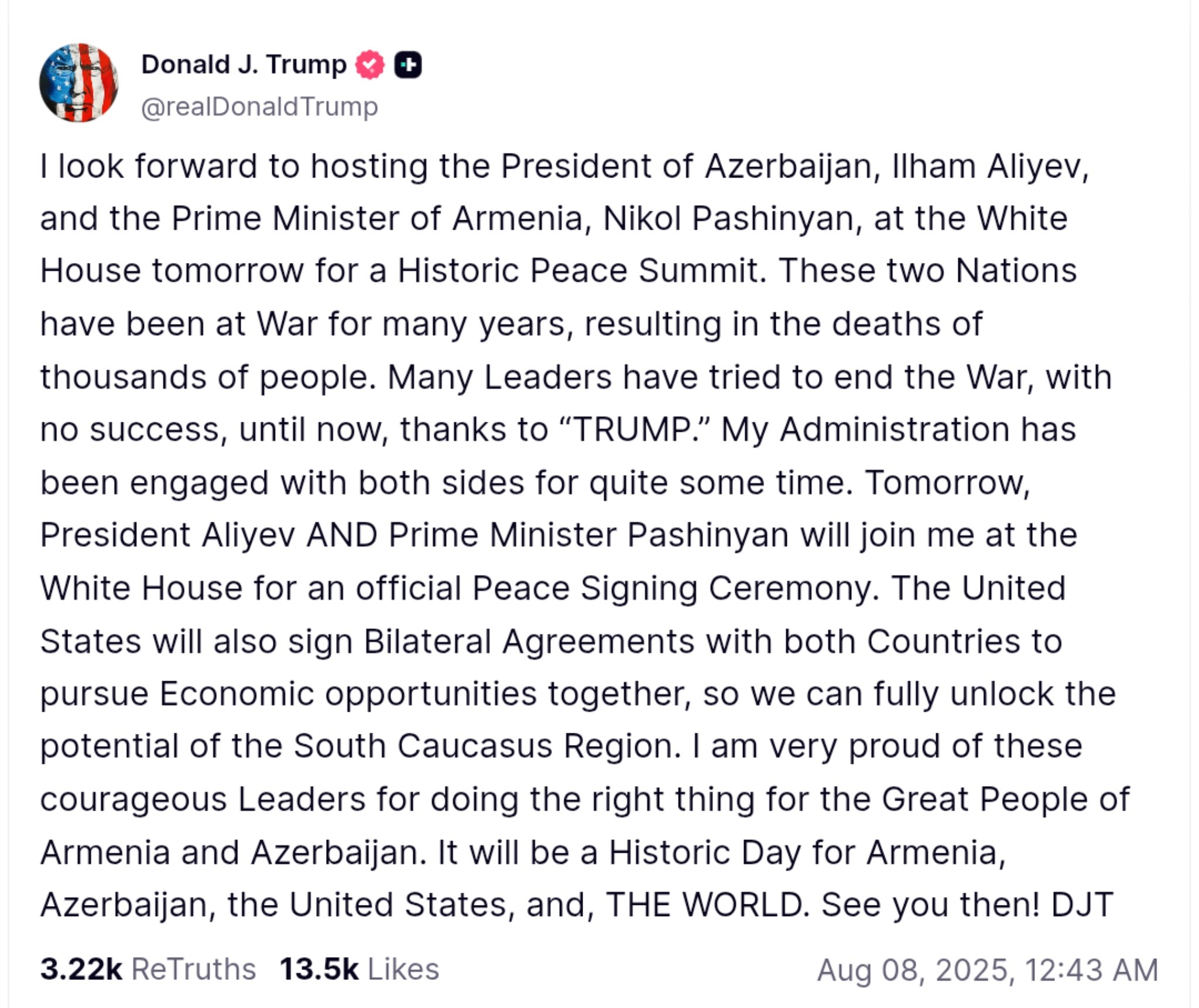 Trump Hosts Azerbaijan and Armenia Leaders for Historic Peace Summit to Resolve Conflict