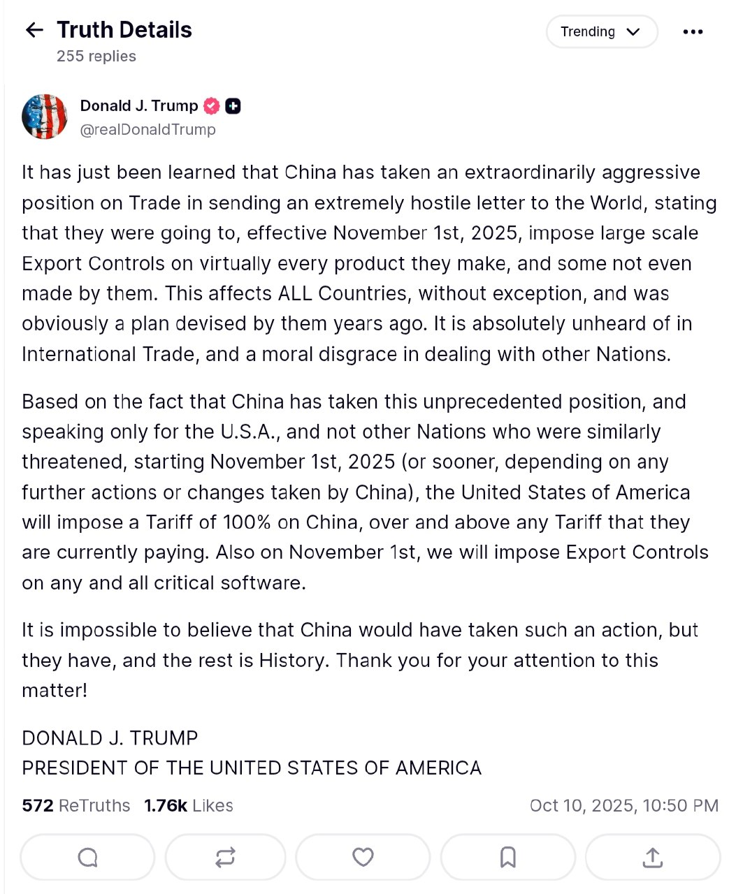 U.S. President Donald Trump has announced a 100% tariff on all imports from China, effective November 1, 2025. This new tariff will be applied on top of existing duties already in place. Additionally, the U.S. will impose controls on critical software exports to China.