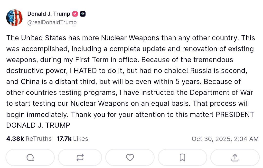 US President Donald Trump announced on Thursday, October 30, 2025, that he has instructed the Department of War to begin testing the country"s nuclear weapons. Trump stated, "Because of other countries testing programs, I have instructed the Department of War to start testing our Nuclear Weapons on an equal basis. That process will begin immediately."