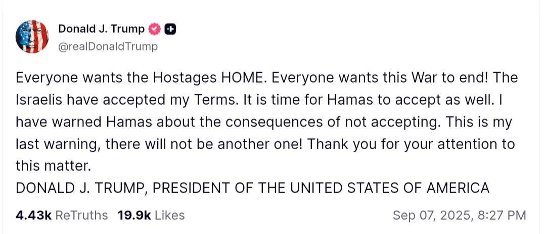 In a dramatic escalation of international tensions, U.S. President Donald Trump issued a stark ultimatum to Hamas today, demanding their acceptance of peace terms that Israel has already agreed to. "Everyone wants the hostages HOME. Everyone wants this war to end!" Trump stated in a public address, emphasizing the urgency for Hamas to comply.