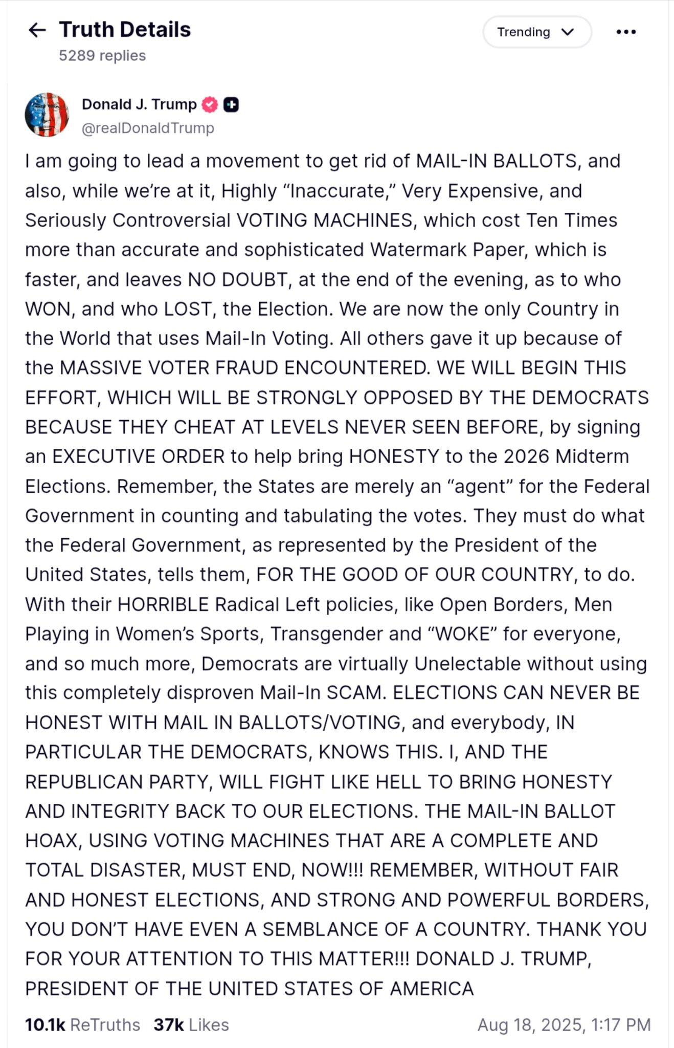 Trump Launches Movement to Ban Mail-In Voting, Advocates for Watermarked Ballots Ahead of 2026 Midterms