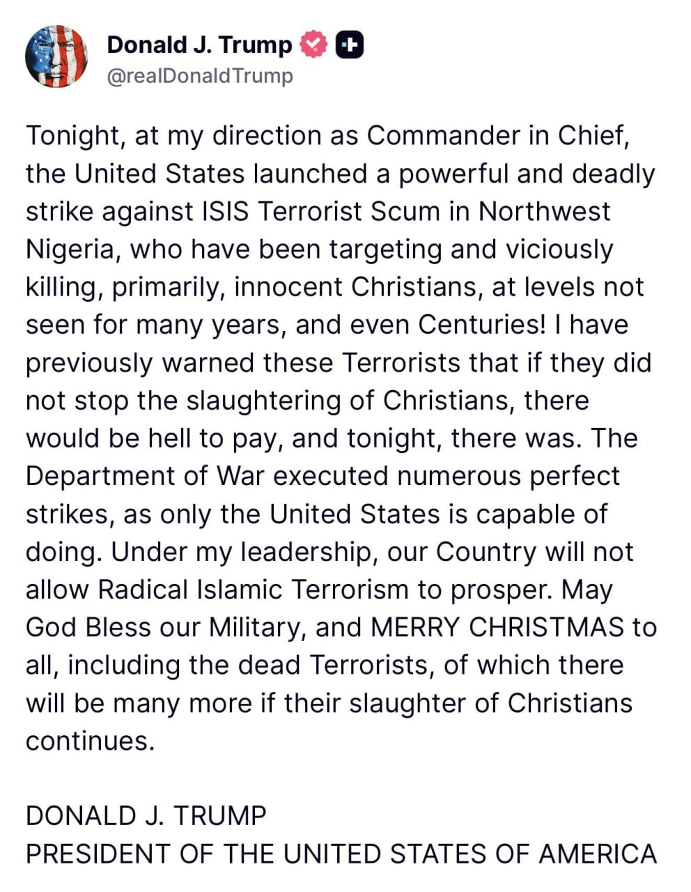 Former President Donald Trump announced that he has ordered "powerful and deadly" military strikes against Islamist groups in Nigeria. This decision comes in response to the killing of Christians by these groups. The announcement was made on Thursday, December 25, 2025.
