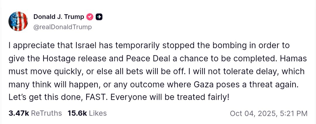 US President Donald Trump expressed appreciation for Israel"s temporary pause in bombing, which aims to facilitate the release of hostages and the completion of a peace deal. Trump emphasized that Hamas must act quickly, warning that delays or any situation where Gaza poses a threat again will not be tolerated. He urged for a swift resolution, stating, "Let’s get this done, FAST," and assured that everyone will be treated fairly.