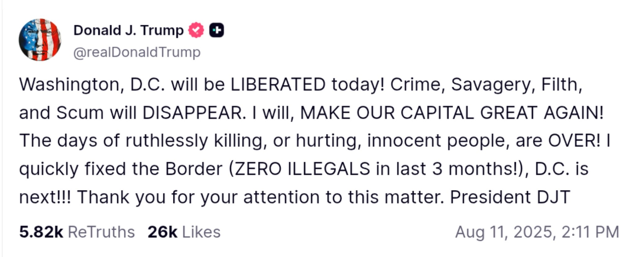 In a bold proclamation that has reverberated throughout the nation, President Donald Trump announced that Washington, D.C. will be "LIBERATED" today, vowing to eradicate crime and restore the capital to its former glory. The announcement comes as part of a broader initiative to address rising concerns about public safety and urban decay, with Trump asserting that the "days of ruthlessly killing or hurting innocent people are OVER." This statement has sparked both support and skepticism among citizens and political analysts alike.
