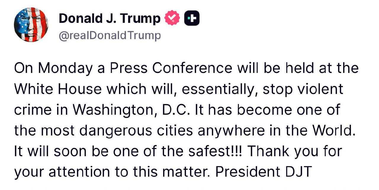 On Monday, former President Donald Trump is set to hold a press conference in Washington, D.C., where he claims to unveil a plan that will "put an end to violent crime" in the nation’s capital. As crime rates, particularly murders, have surged in recent years, Trump’s announcement comes amid growing public concern over safety in the city, which has recently been ranked among the most dangerous in the world.