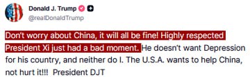 Former President Donald Trump stated, "Don"t worry about China, it will all be fine... Xi just had a bad moment." This comment was made during a recent public appearance as he addressed concerns regarding China"s current situation.