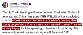 Former President Donald Trump announced that a recent trade meeting between the United States and China went "VERY WELL." He stated that a deal has been reached concerning a "certain" company that young people in the U.S. wanted to save.