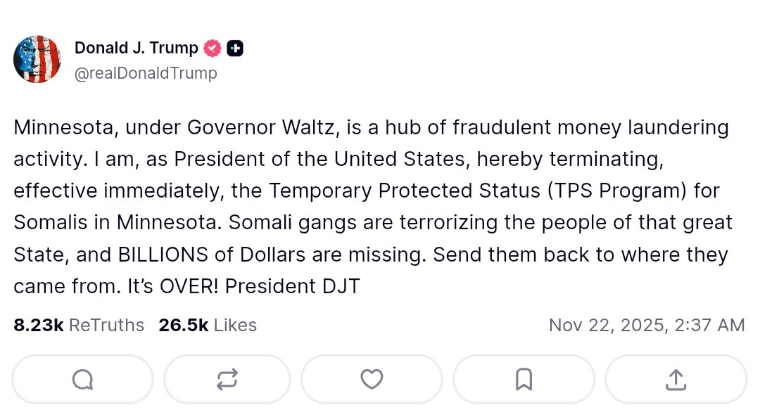 US President Donald Trump has announced the immediate termination of the Temporary Protected Status (TPS) program for Somalis residing in Minnesota. This decision affects individuals who have been granted TPS due to conditions in their home country.