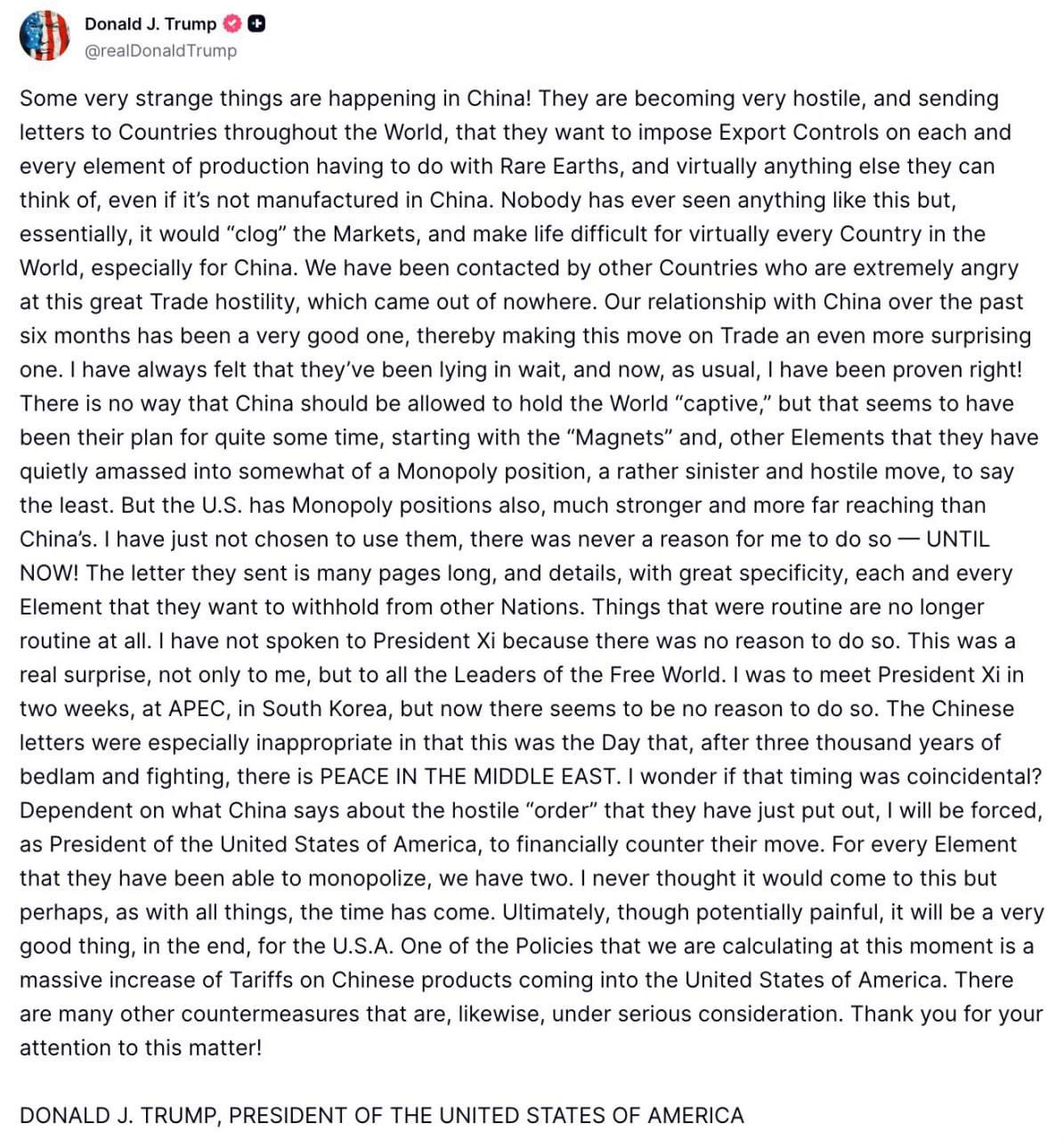 US President Donald Trump criticized China"s recent expansion of export controls on rare earth elements, labeling it a "hostile" attempt to monopolize global supply chains. The Chinese Ministry of Commerce announced on October 9, 2025, that it has added five elements—holmium, erbium, thulium, europium, and ytterbium—to its restricted list, which now includes 12 of the 17 rare earths essential for defense, semiconductors, and electric vehicles.